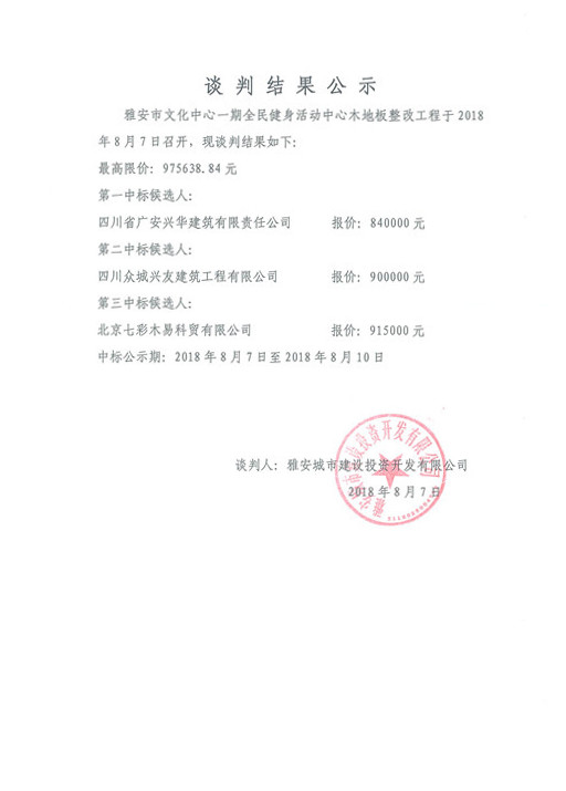 雅安市文化中心一期全民健身活動(dòng)中心木地板整改工程競(jìng)爭(zhēng)性談判結(jié)果公示