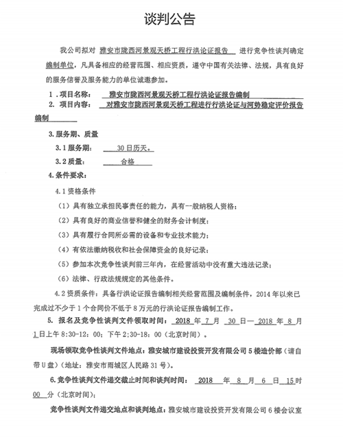 雅安市隴西河景觀天橋工程行洪論證報(bào)告競爭性談判公告
