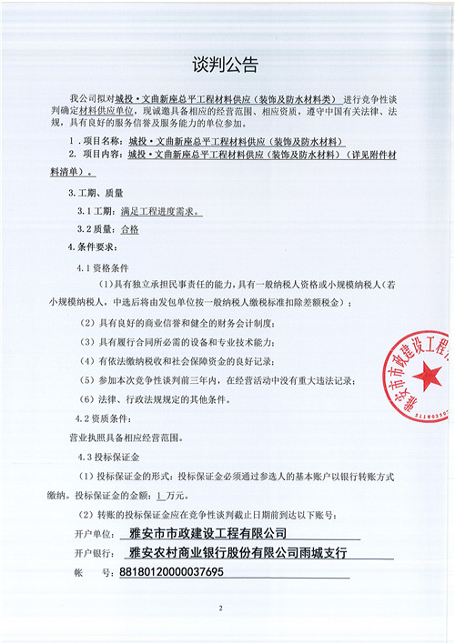 市政公司城投•文曲新座總平工程材料供應(yīng)(裝飾及防水材料)競爭性談判公告