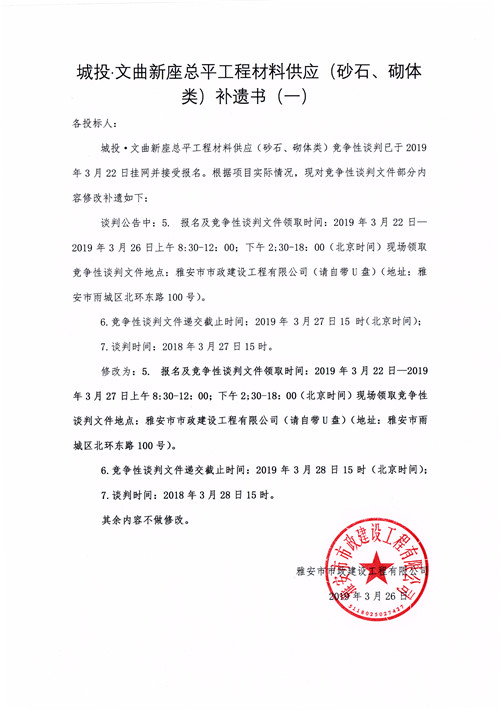 城投·文曲新座總平工程材料供應(yīng)(砂石、砌體類)競(jìng)爭(zhēng)性談判公告補(bǔ)遺一