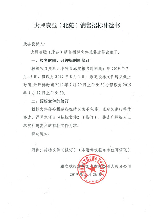 大興壹號(hào)(北苑)銷售招標(biāo)補(bǔ)遺書(shū)