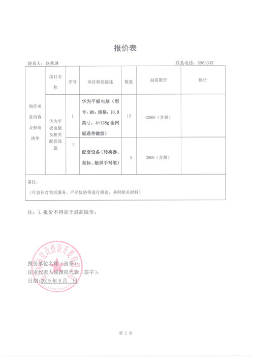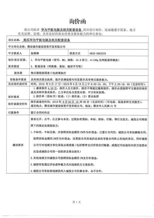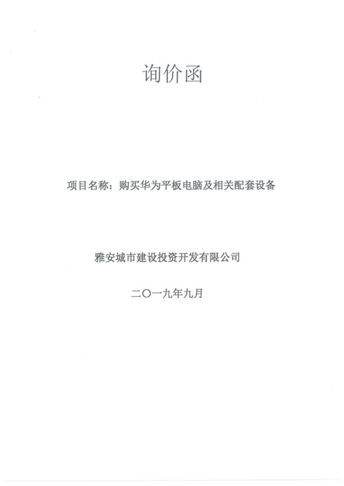 城投公司購買華為平板電腦及相關(guān)配套設備詢價函