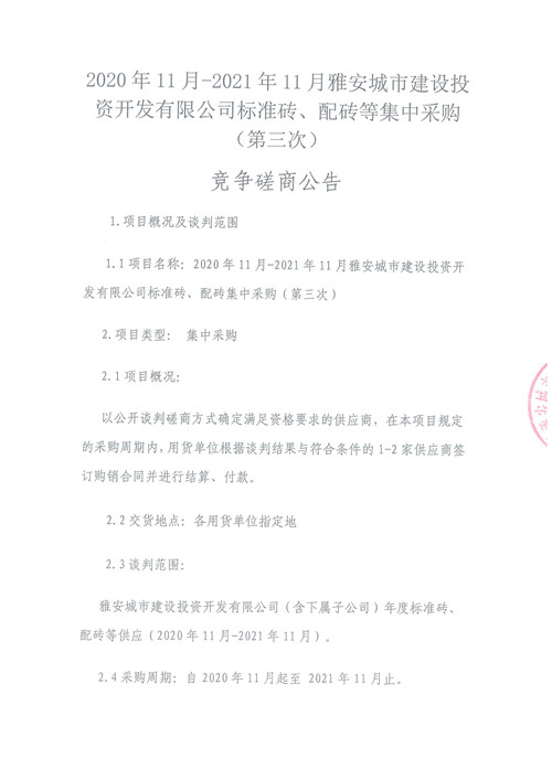 2020年11月-2021年11月雅安城市建設(shè)投資開(kāi)發(fā)有限公司標(biāo)準(zhǔn)磚、配磚等集中采購(gòu)(第三次)競(jìng)爭(zhēng)磋商公告