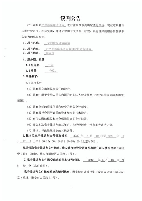 物業(yè)公司文曲新座建渣清運(yùn)確定清運(yùn)單位的競爭性談判公告
