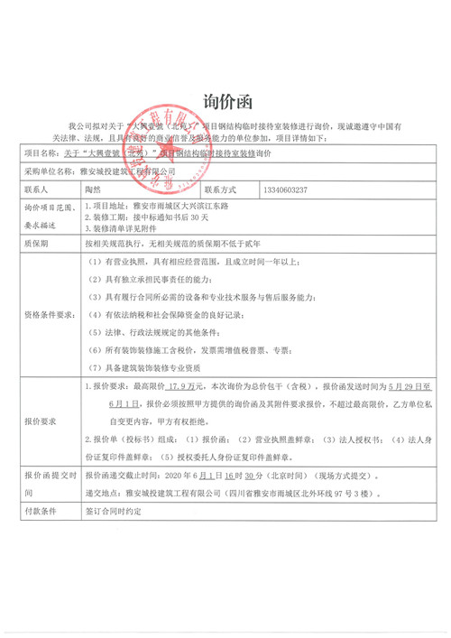 城投建工公司“大興壹號(北苑)”項目鋼結(jié)構(gòu) 臨時接待室裝修的詢價函