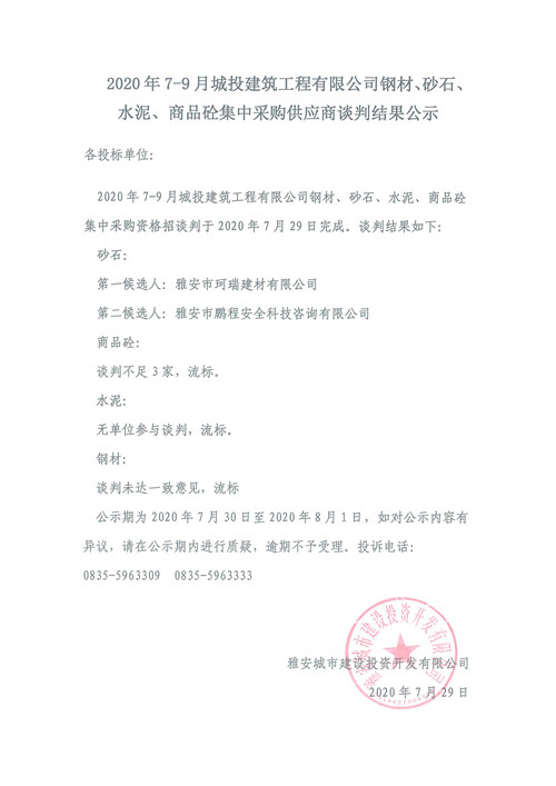 2020年7月-9月城投建筑工程有限公司鋼材、砂石、水泥、商品砼集中采購(gòu)供應(yīng)商談判結(jié)果公示
