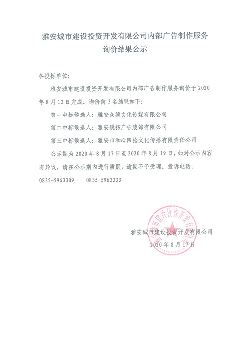 雅安城市建設(shè)投資開(kāi)發(fā)有限公司公司內(nèi)部廣告制作服務(wù)詢價(jià)結(jié)果公示