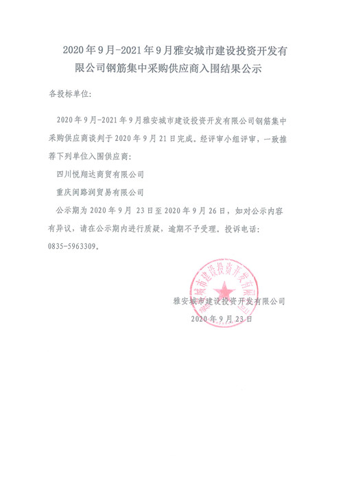 2020年9月-2021年9月雅安城市建設(shè)投資開(kāi)發(fā)有限公司鋼筋集中采購(gòu)供應(yīng)商入圍結(jié)果公示