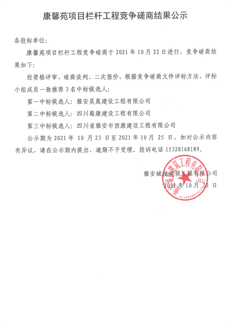 康馨苑項目欄桿工程競爭磋商結果公示