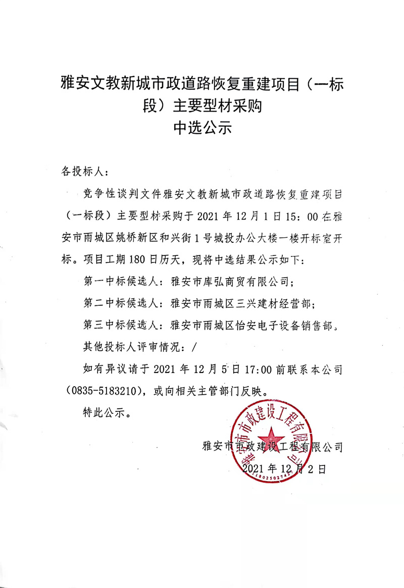 雅安文教新城市政道路恢復(fù)重建項(xiàng)目(一標(biāo)段)主要型材采購中選公示