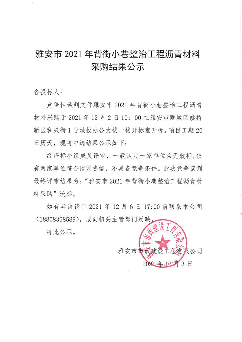 雅安市2021年背街小巷整治工程瀝青材料采購(gòu)結(jié)果公示