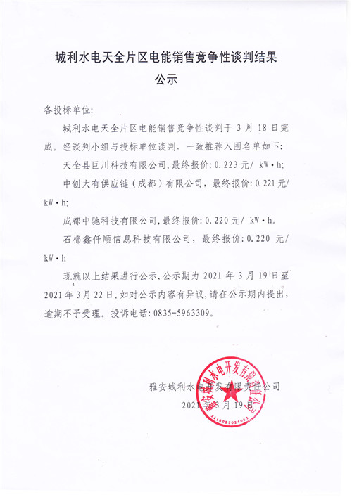 城投水電公司天全片區(qū)電站電能銷售競爭性談判結果公示