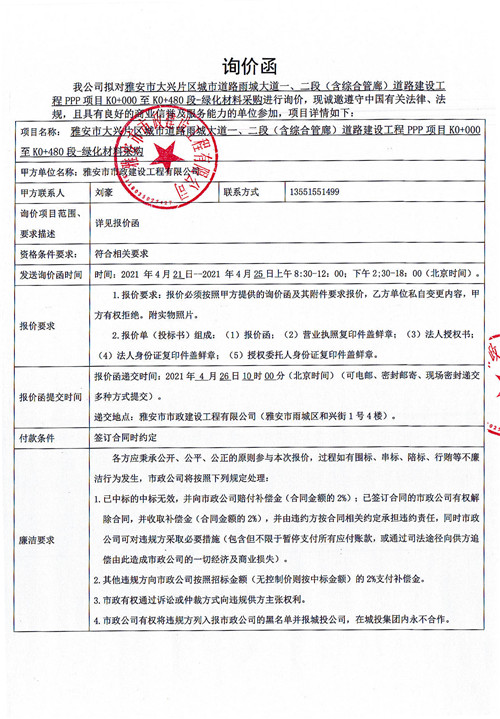 雅安市大興片區(qū)城市道路雨城大道一、二段(含綜合管廊)道路建設(shè)工程PPP項(xiàng)目K0+000至K0+480段-綠化材料采購詢價(jià)函