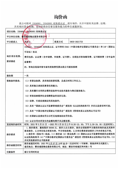 城投物業(yè)IS04001、IS045001雙體系認(rèn)證詢價函