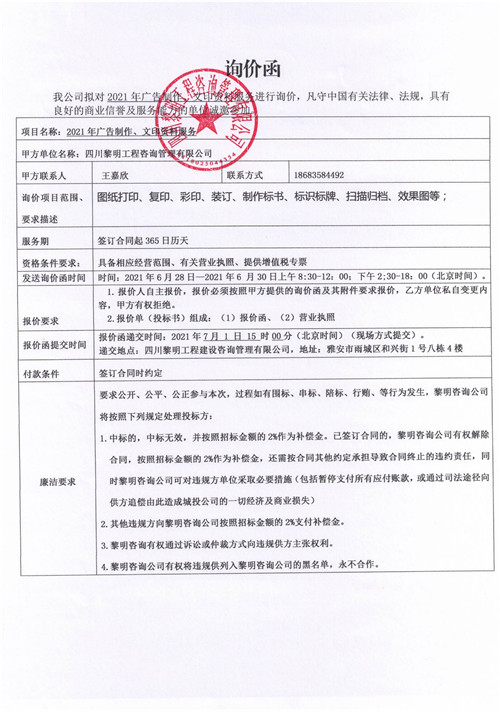 黎明咨詢公司2021年廣告制作、文印資料服務詢價函