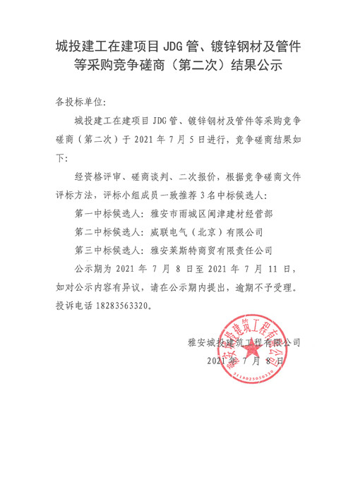 城投建工公司在建項(xiàng)目JDG管、鍍鋅鋼材及管件等采購(gòu)競(jìng)爭(zhēng)性磋商(第二次)結(jié)果公示