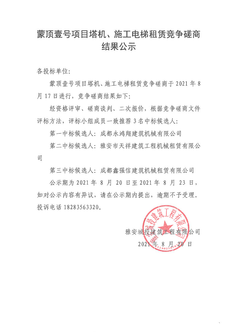 城投建工公司蒙頂壹號項目塔機、施工電梯租賃競爭磋商結果公告