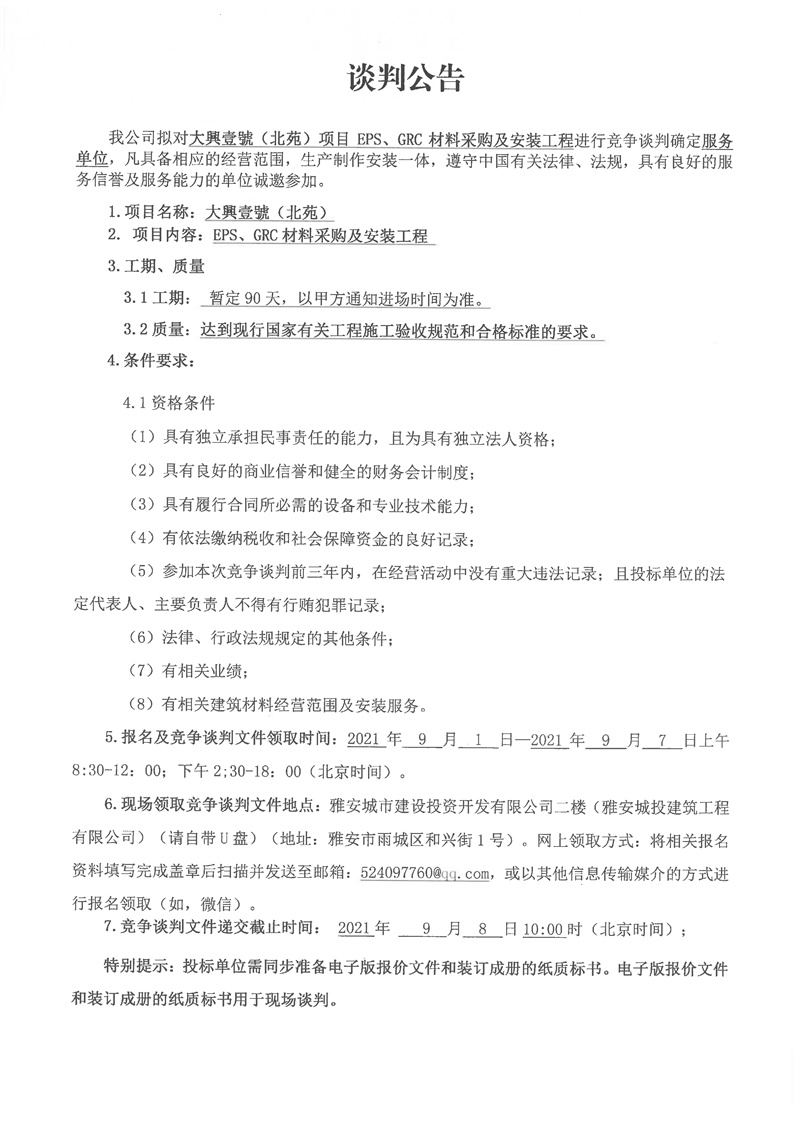 大興壹號(hào)(北苑)項(xiàng)目EPS、GRC材料采購(gòu)及安裝工程競(jìng)爭(zhēng)談判公告