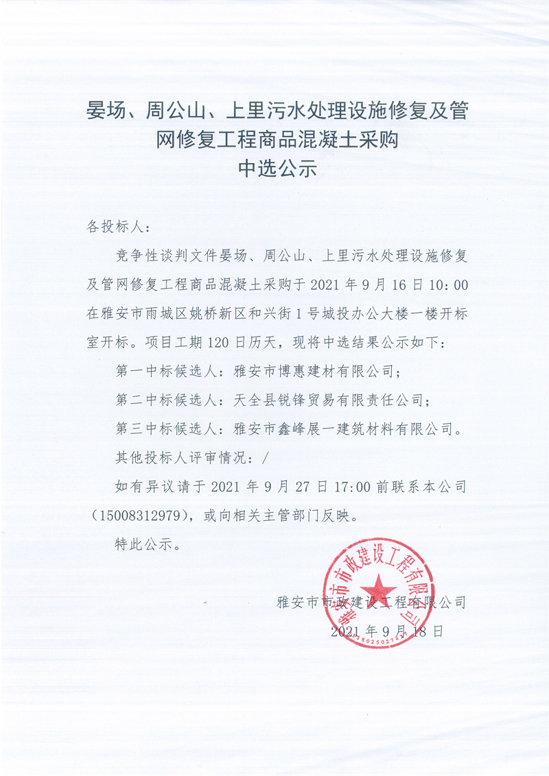 晏場、周公山、上里污水處理設施修復及管網修復工程商品混凝土采購競爭性談判結果公示