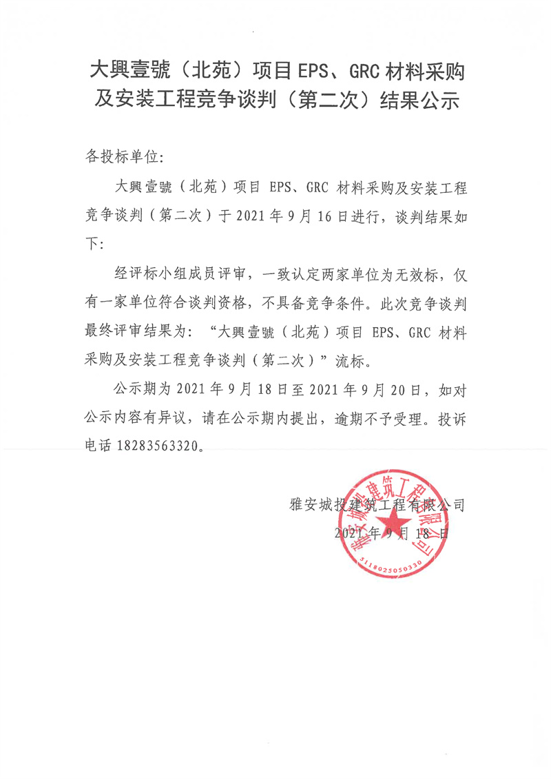 大興壹號(北苑)項目EPS、GRC材料采購及安裝工程競爭談判(第二次)結果公示