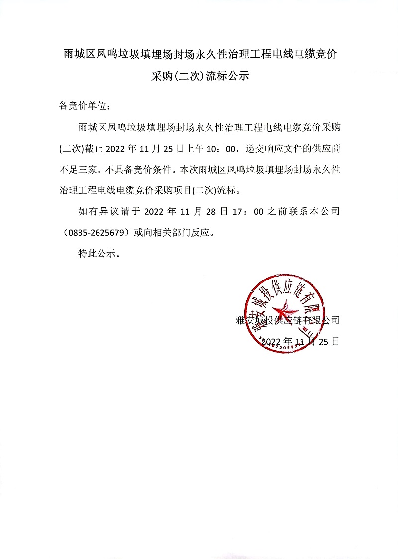 雨城區(qū)鳳鳴垃圾填埋場封場永久性治理工程電線電纜競價(jià)采購(二次)流標(biāo)公示