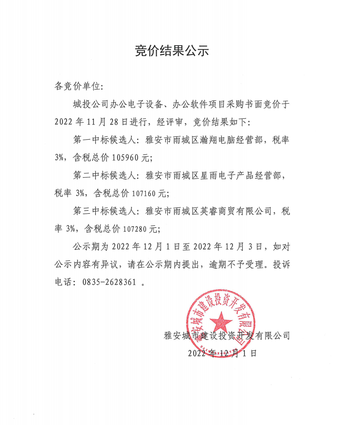 雅安城市建設投資開發(fā)有限公司辦公電子設備、辦公軟件項目采購競價結(jié)果公示