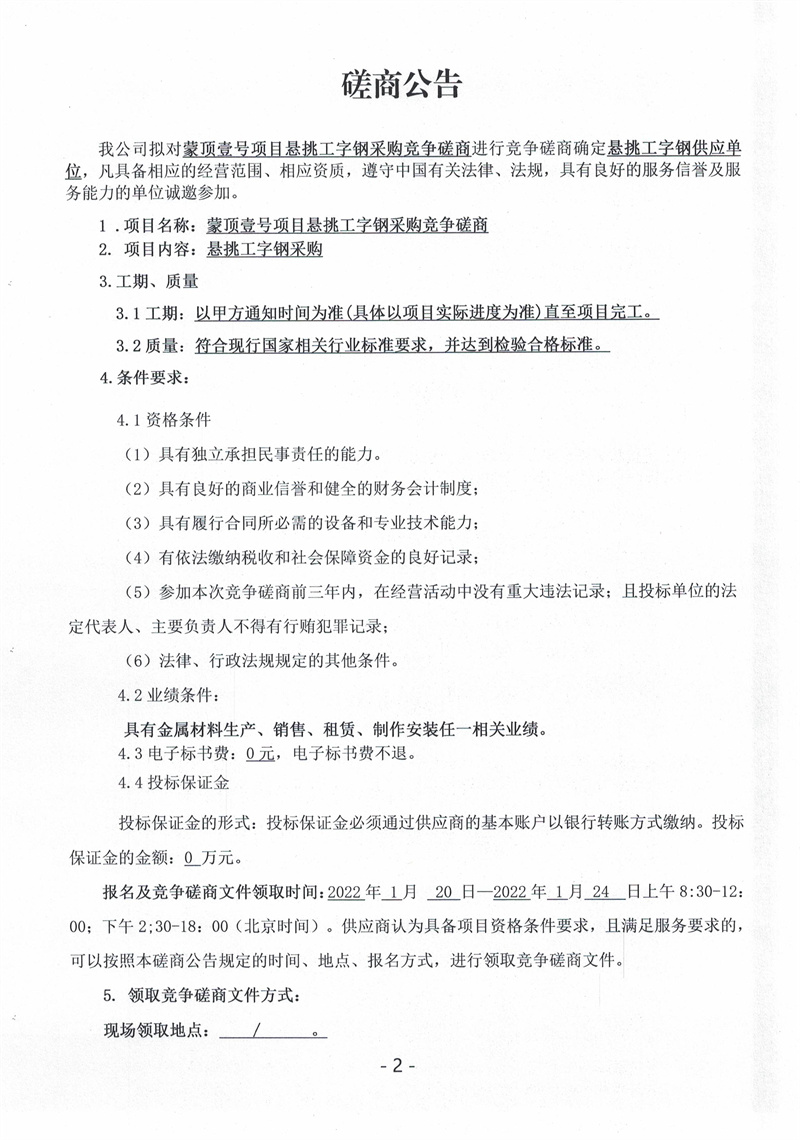 蒙頂壹號項目懸挑工字鋼采購競爭磋商公告