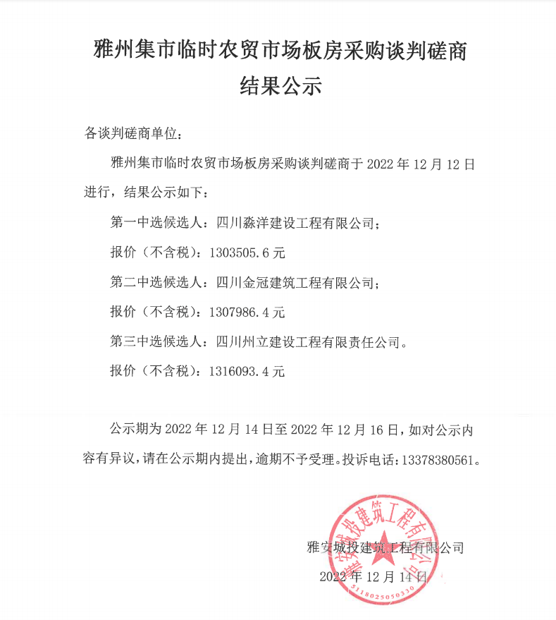 雅州集市臨時(shí)農(nóng)貿(mào)市場板房采購談判磋商結(jié)果公示