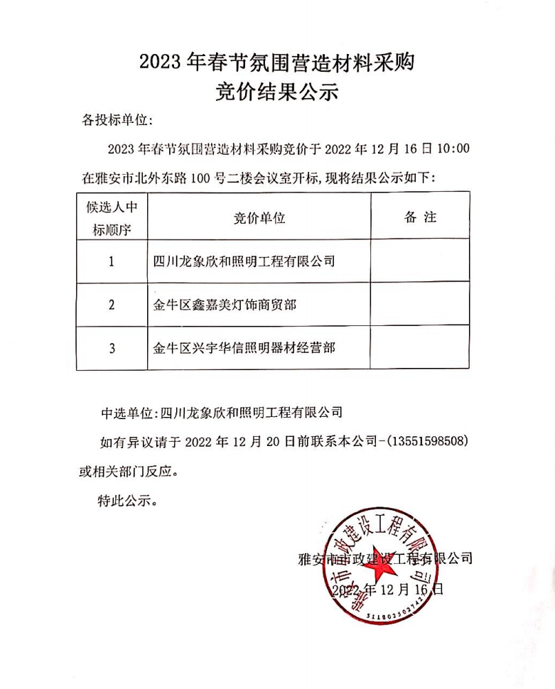 2023年春節(jié)氛圍營造材料采購競價結(jié)果公示