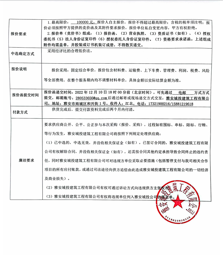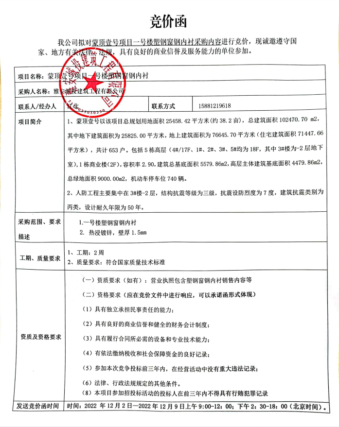 蒙頂壹號項(xiàng)目一號樓塑鋼窗鋼內(nèi)襯競價(jià)公告