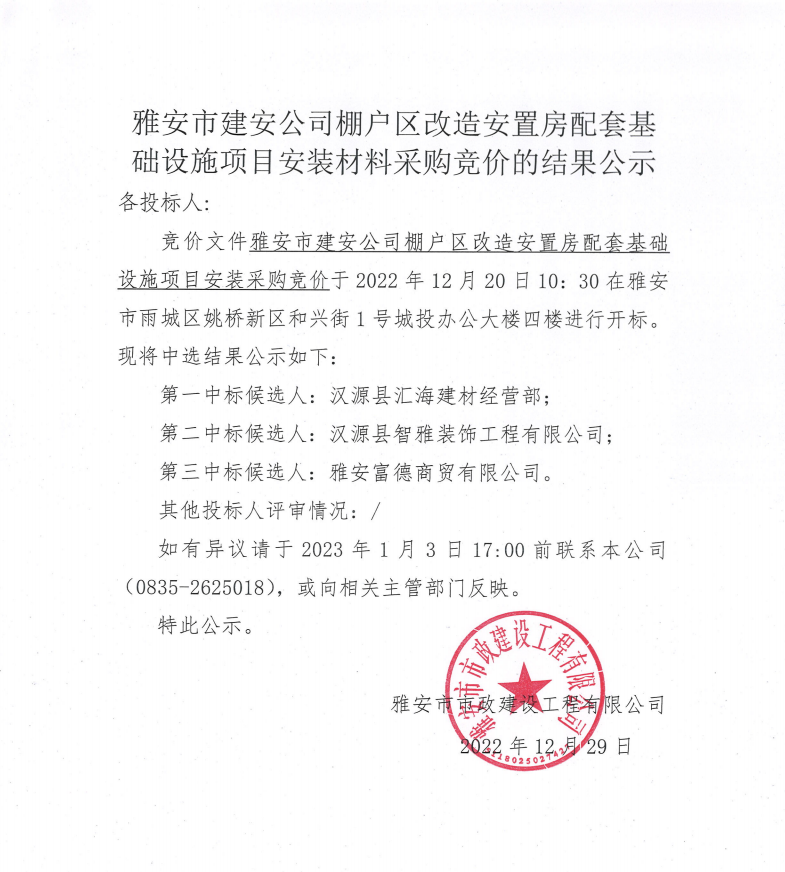雅安市建安公司棚戶(hù)區(qū)改造安置房配套基礎(chǔ)設(shè)施項(xiàng)目安裝材料采購(gòu)競(jìng)價(jià)結(jié)果公示