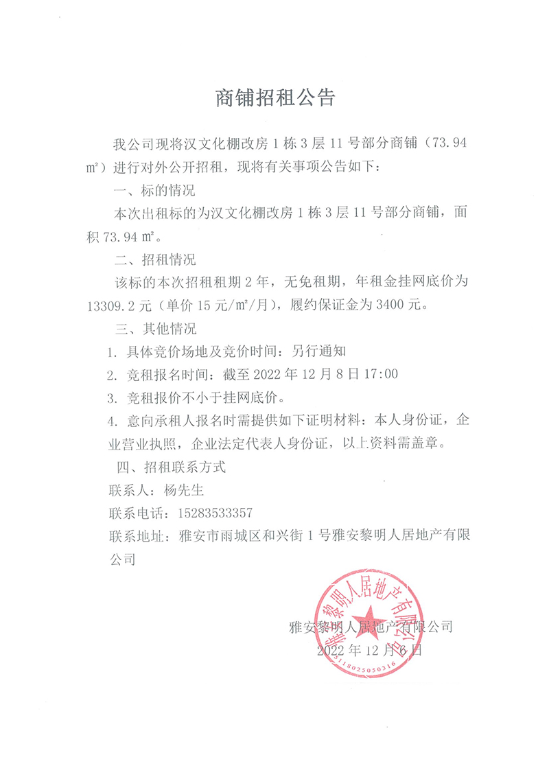 漢文化棚改房1棟3層11號部分商鋪招租公告