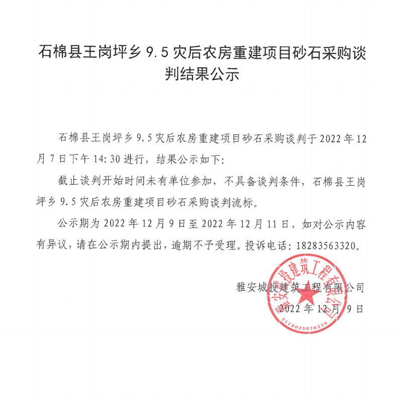 石棉縣王崗坪鄉(xiāng)9.5災(zāi)后農(nóng)房重建項(xiàng)目砂石采購(gòu)談判結(jié)果公示