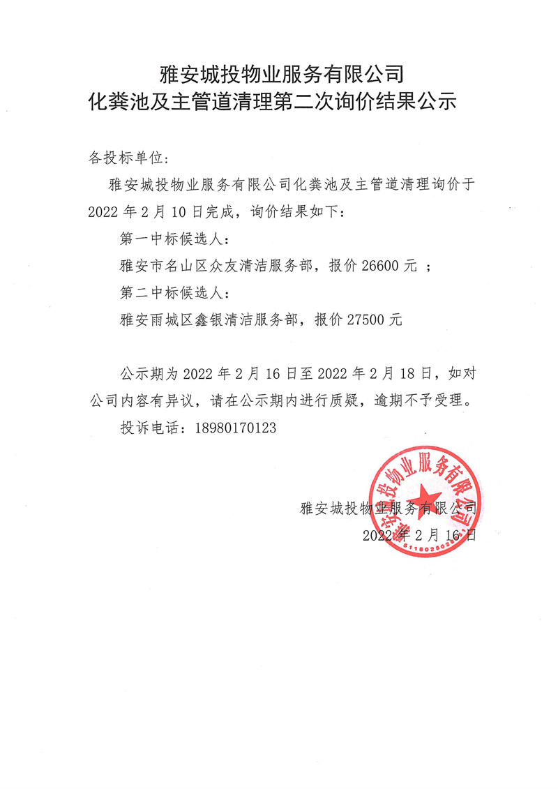 雅安城投物業(yè)服務(wù)有限公司化糞池及主管道清理詢價(jià)結(jié)果公示
