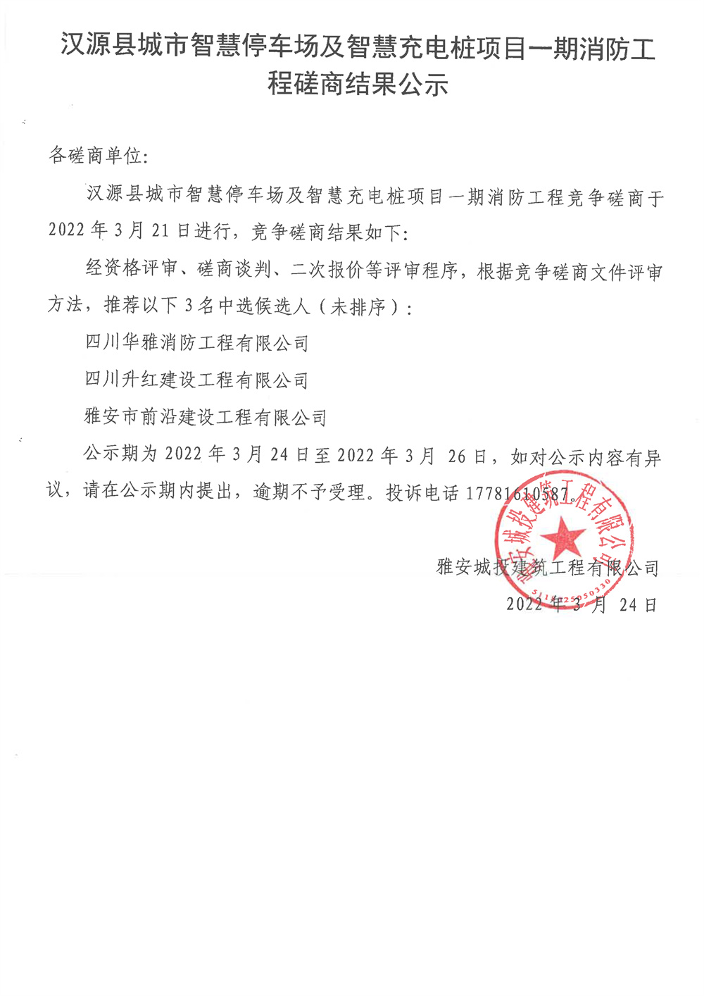 漢源縣城市智慧停車(chē)場(chǎng)及智慧充電樁項(xiàng)目一期消防工程磋商結(jié)果公示