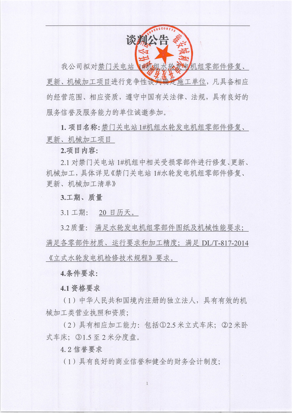 禁門關(guān)電站1#機(jī)組水輪發(fā)電機(jī)組零部件更新、機(jī)械加工項目競爭性談判公告