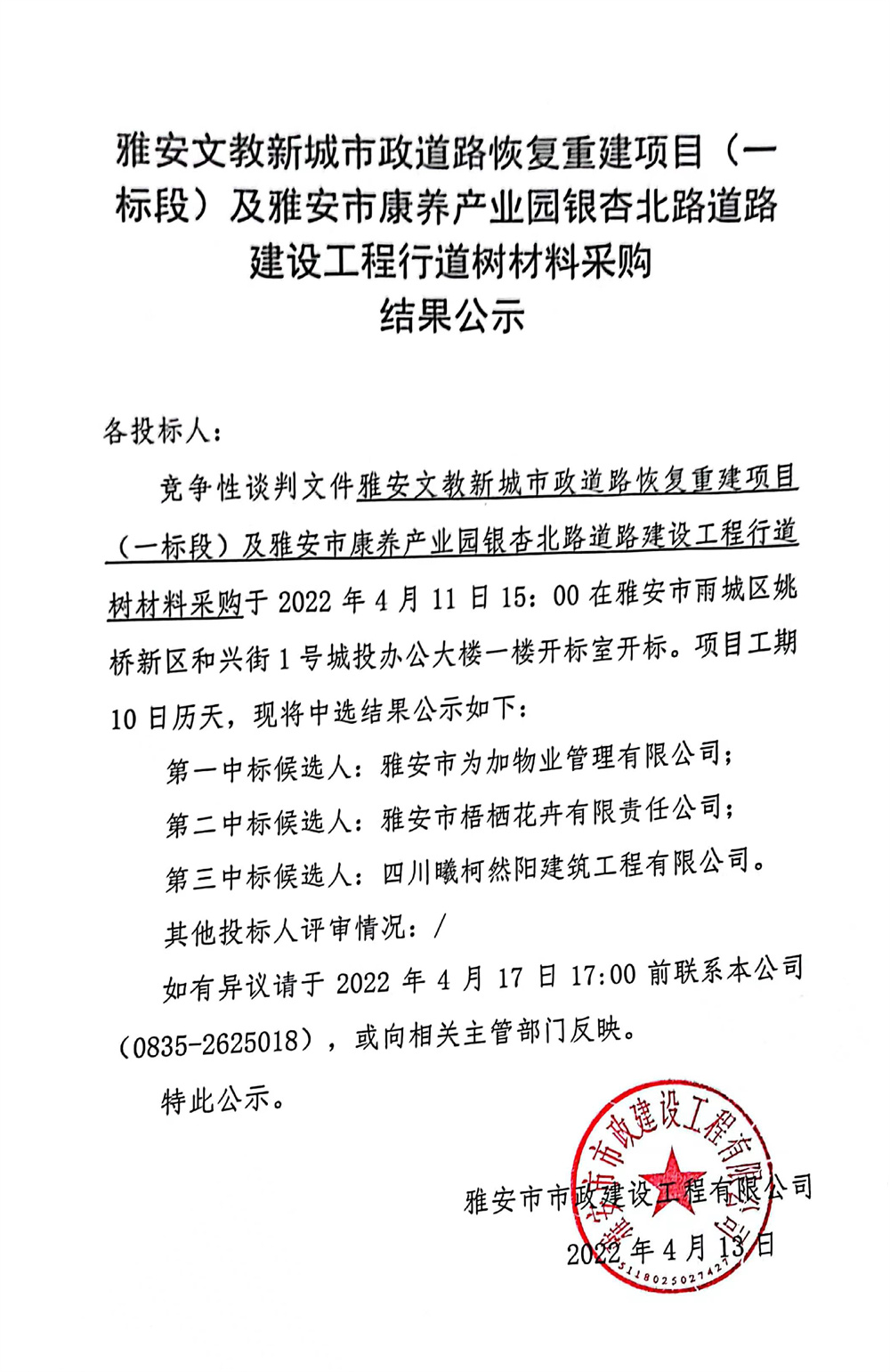 雅安文教新城市政道路恢復重建項目(一標段)及雅安市康養(yǎng)產(chǎn)業(yè)園銀杏北路道路建設工程行道樹材料采購結果公示