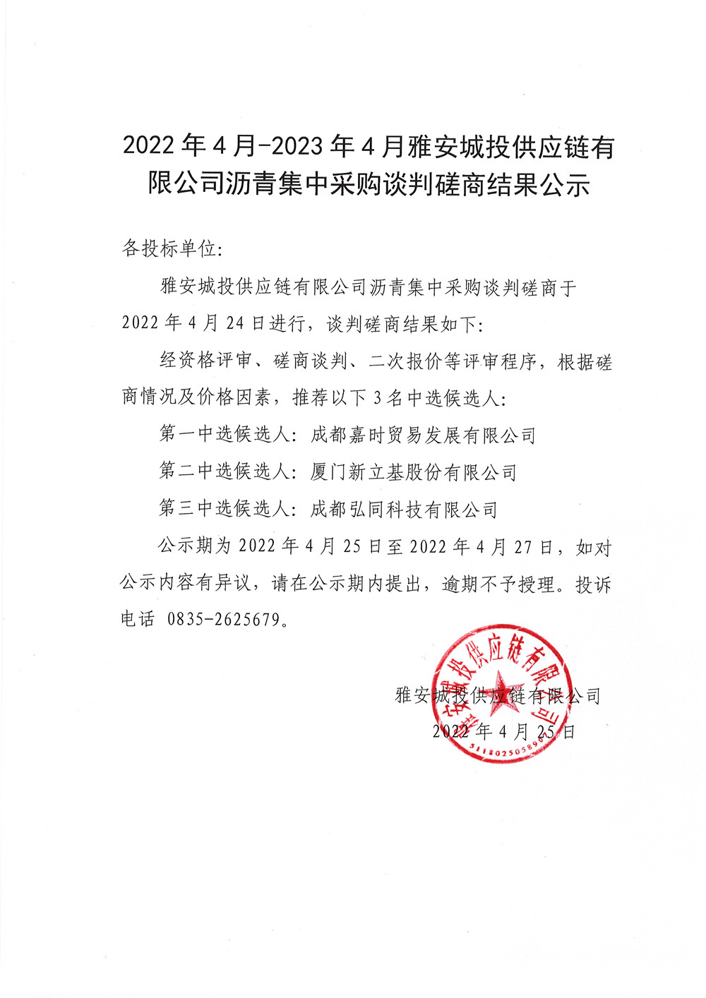 2022年4月-2023年4月雅安城投供應(yīng)鏈有限公司瀝青談判磋商結(jié)果公示