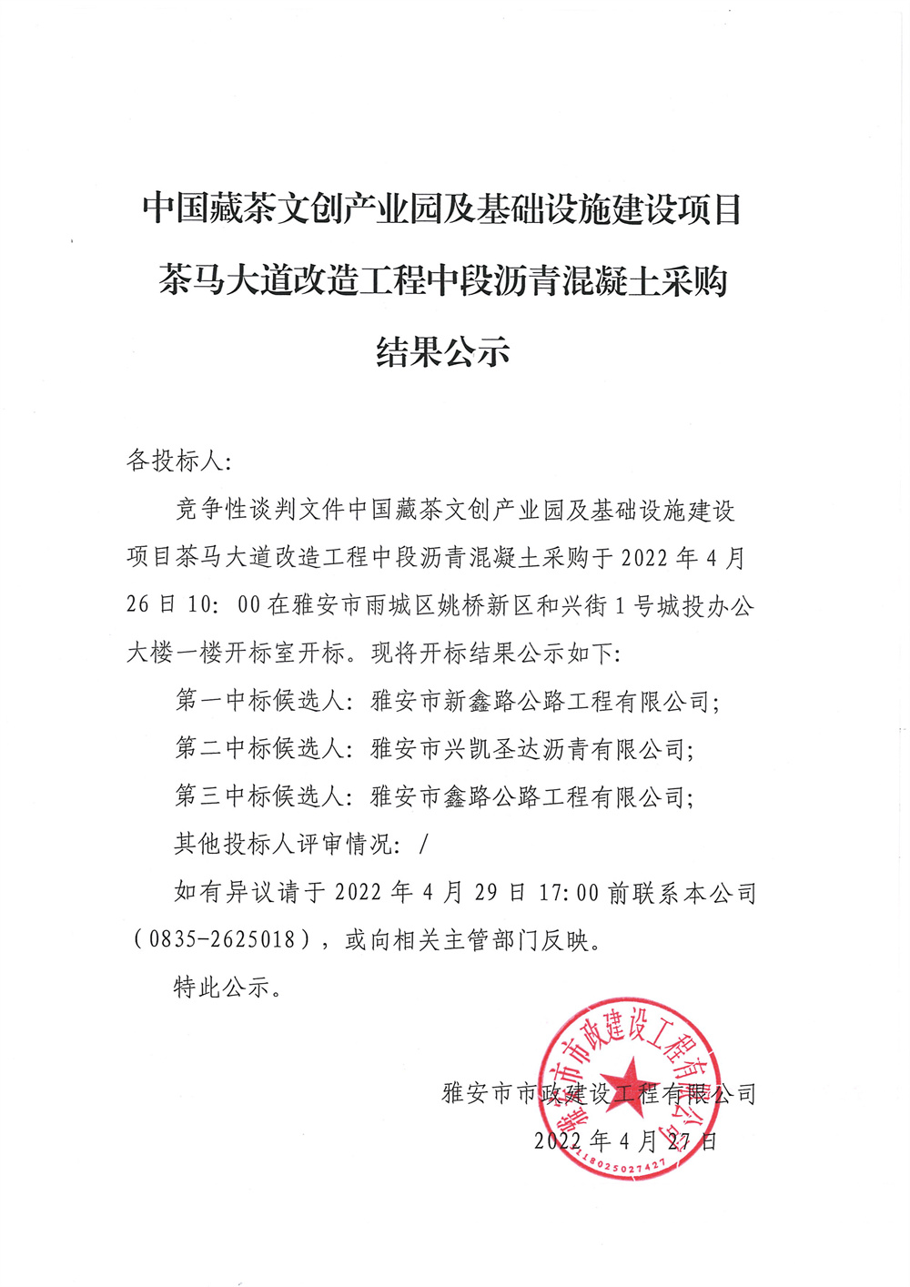 中國(guó)藏茶文創(chuàng)產(chǎn)業(yè)園及基礎(chǔ)設(shè)施建設(shè)項(xiàng)目茶馬大道改造工程中段瀝青采購競(jìng)爭(zhēng)性談判結(jié)果公示