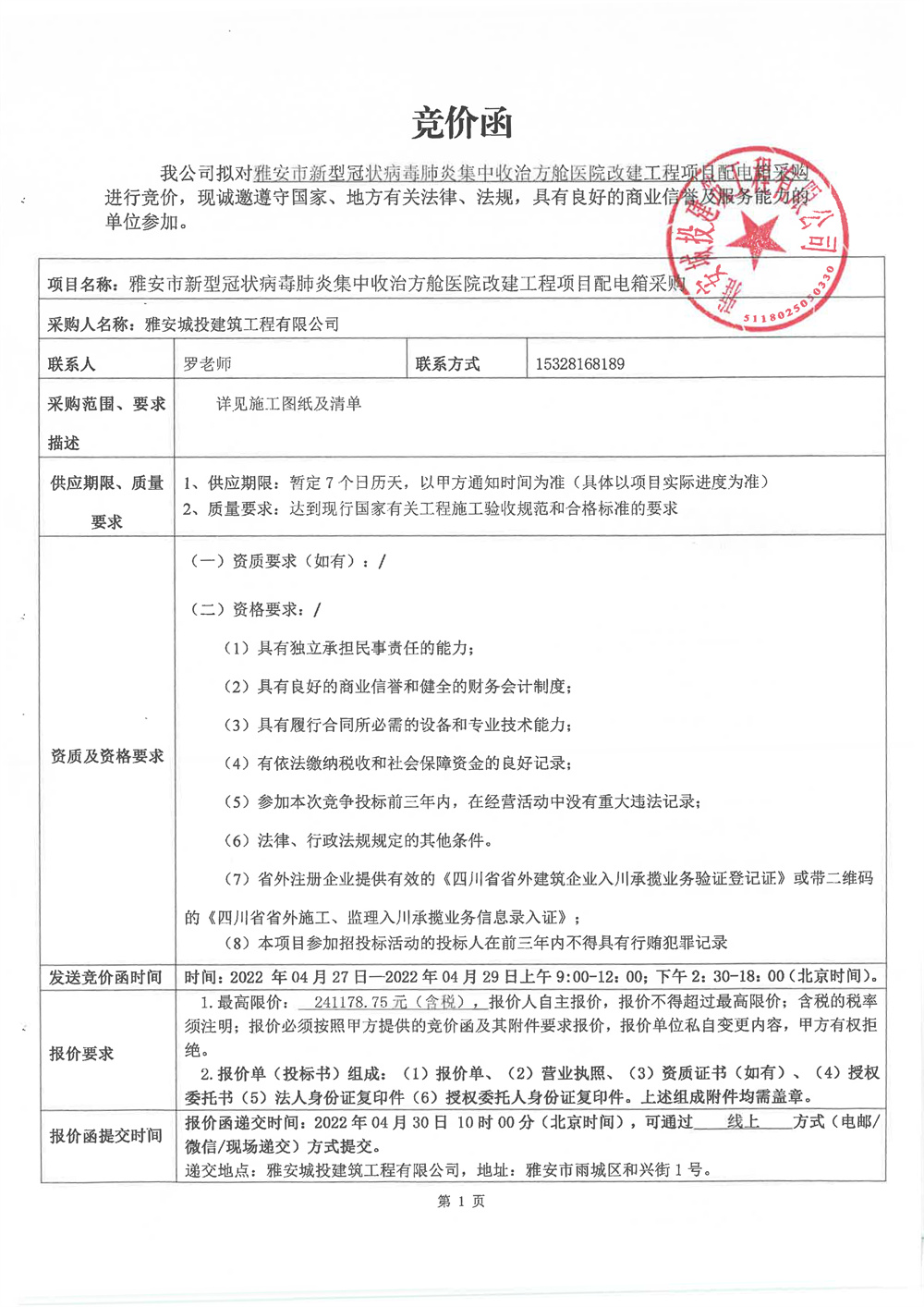 雅安市新型冠狀病毒肺炎集中收治方艙醫(yī)院改建工程項目配電箱采購