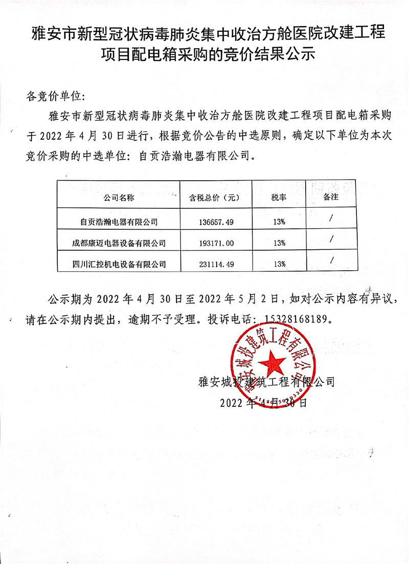 雅安市新型冠狀病毒肺炎集中收治方艙醫(yī)院改建工程項(xiàng)目配電箱采購(gòu)的競(jìng)價(jià)結(jié)果公示