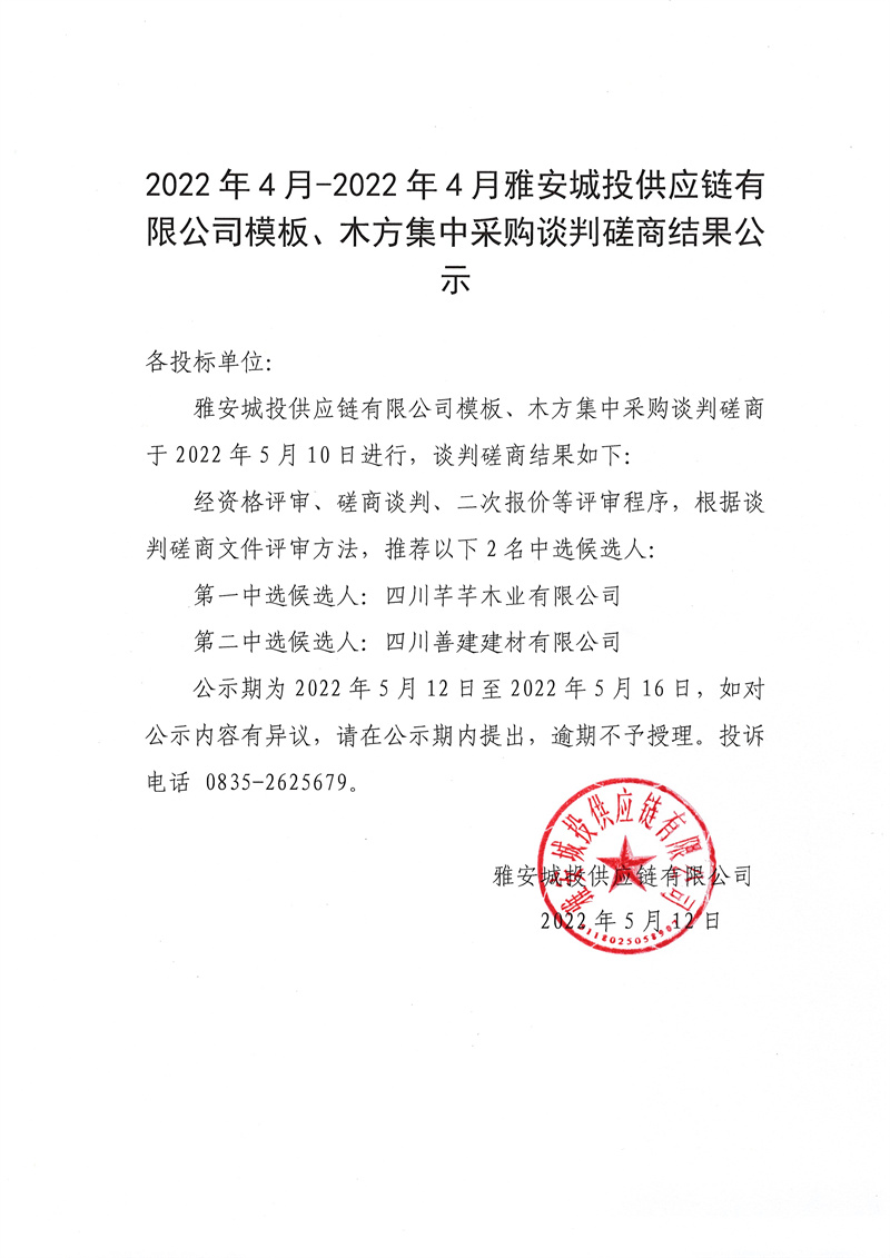 2022年4月-2023年4月雅安城投供應(yīng)鏈有限公司模板、木方集中采購(gòu)談判磋商結(jié)果公示
