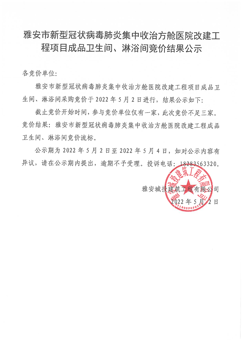 雅安市新型冠狀病毒肺炎集中收治方艙醫(yī)院改建工程項(xiàng)目成品衛(wèi)生間、淋浴間競價結(jié)果公示
