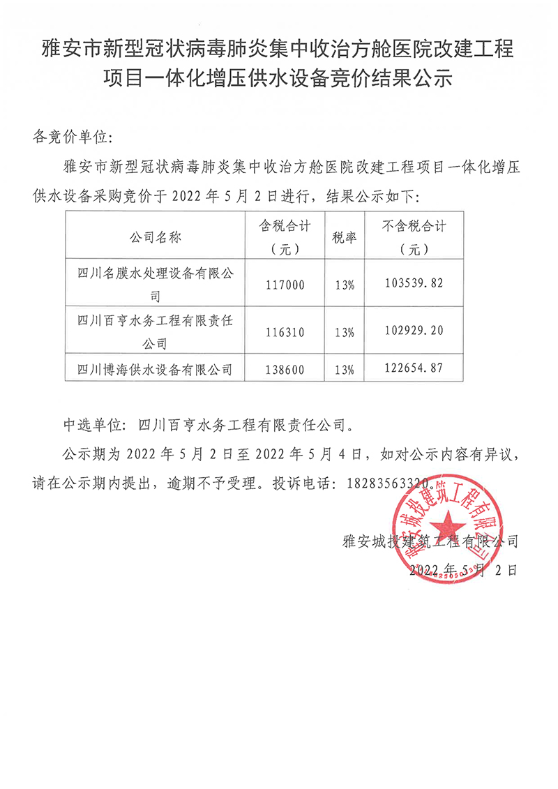 雅安市新型冠狀病毒肺炎集中收治方艙醫(yī)院改建工程項目一體化增壓供水設(shè)備競價結(jié)果公示