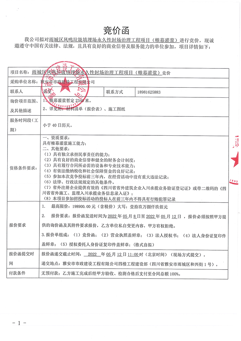 雨城區(qū)鳳鳴垃圾填埋場永久性封場治理工程項(xiàng)目(帷幕灌漿)競價(jià)公告