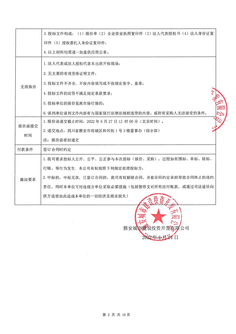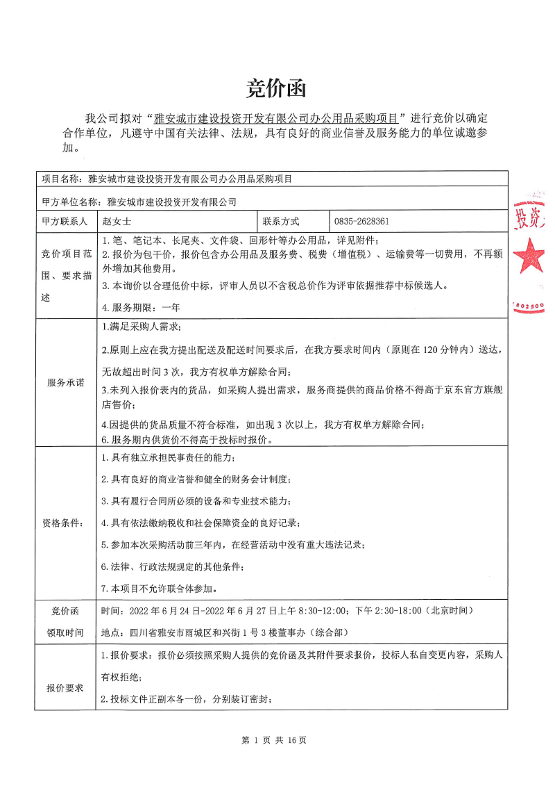 雅安城市建設(shè)投資開發(fā)有限公司辦公用品采購項目競價公告