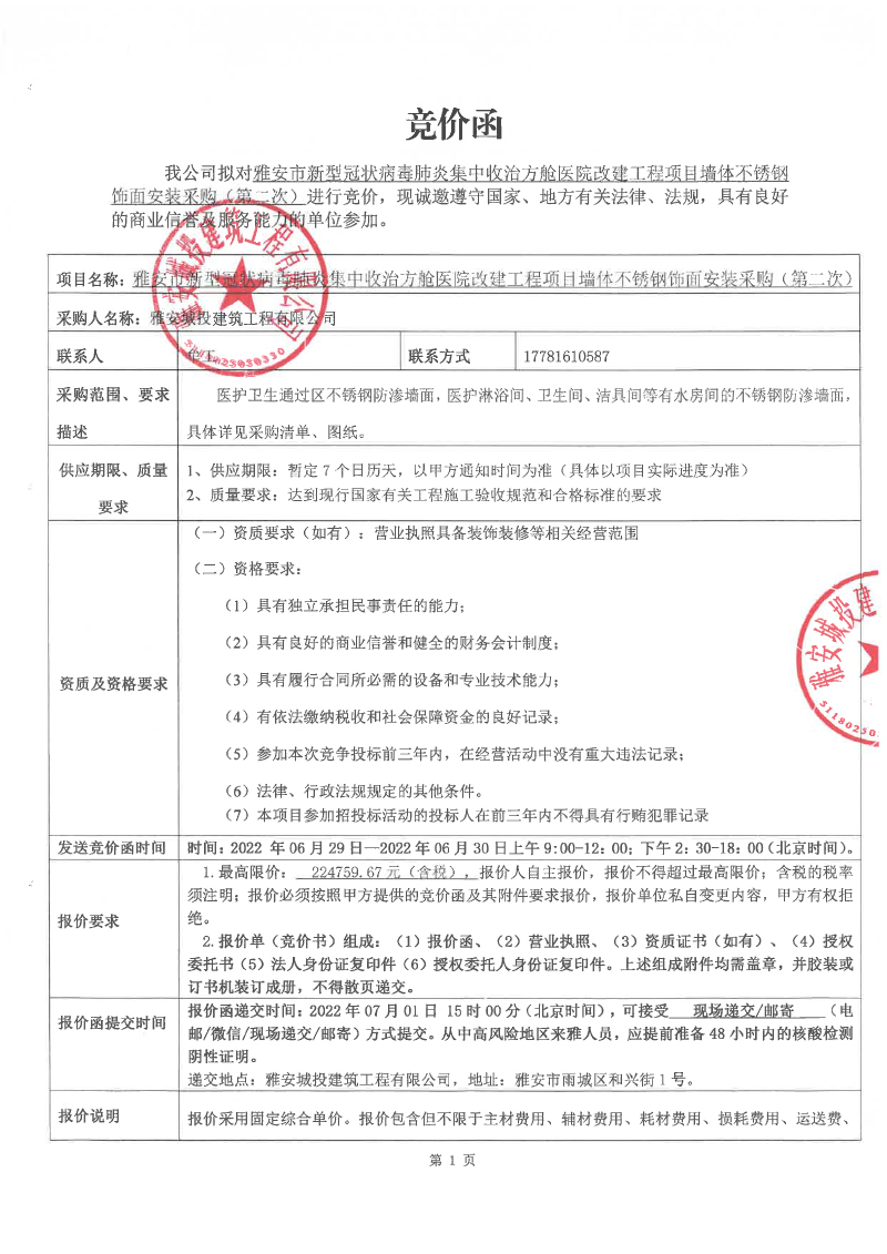 雅安市新型冠狀病毒肺炎集中收治方艙醫(yī)院改建工程項(xiàng)目墻體不銹鋼飾面安裝競價采購(第二次)