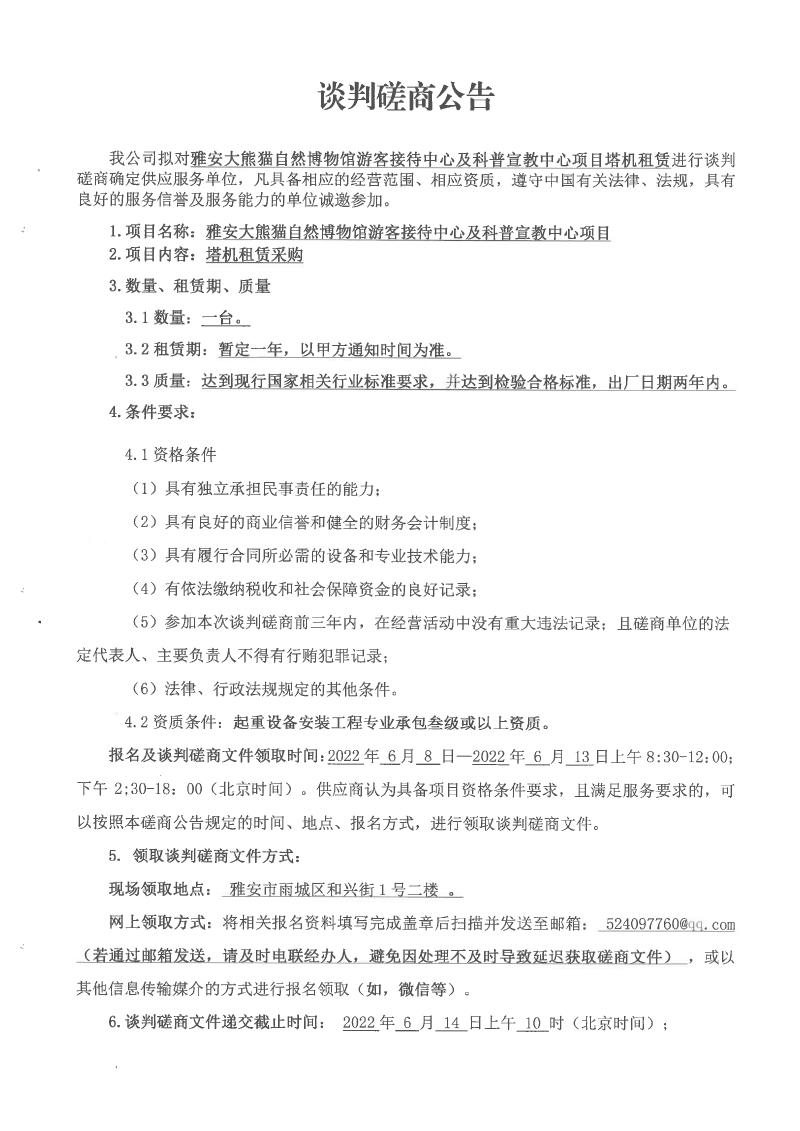 雅安大熊貓自然博物館游客接待中心及科普宣教中心項目塔機(jī)租賃談判磋商公告