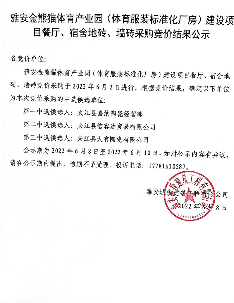 雅安金熊貓體育產(chǎn)業(yè)園(體育服裝標(biāo)準(zhǔn)化廠房)建設(shè)項目餐廳、宿舍地磚、墻磚競價結(jié)果公示