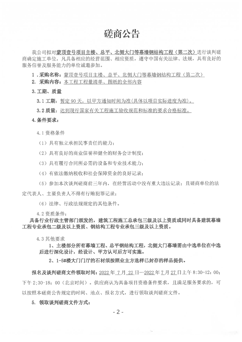 蒙頂壹號項(xiàng)目主樓、總坪、北側(cè)大門等幕墻鋼結(jié)構(gòu)工程(第二次)談判磋商公告